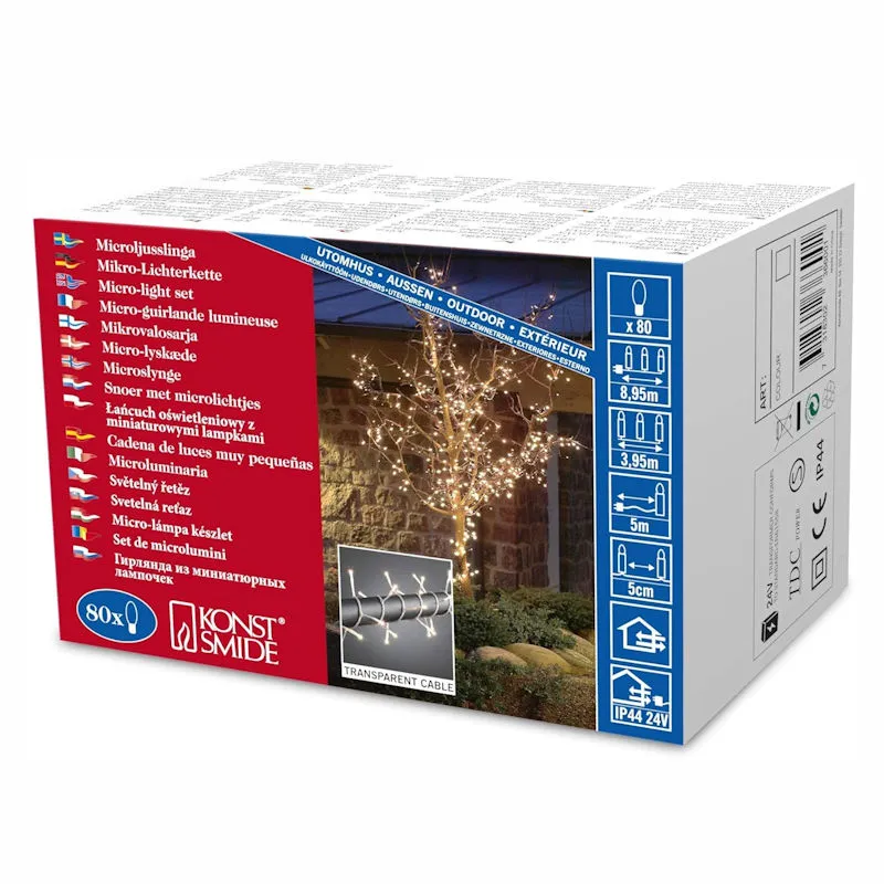 Abmessungen: 8,95 Meter, davon 5 Meter Zuleitung Licht: 80 warmweisse Micro LED LED Abstand 5 cm LED Micro LED Kabel: klar/transparent Schutzart: IP 44 - Aussen und Innen Anschluss: Steckertrafo 24 Volt Nicht Dimmbar Kein Timer LED nicht wechselbar 80 LED x 0,105VA Lieferant: Konstsmide Typ/Kennung: 2366-003 Energieeffizienzklasse G Energieeffizienzklassen von A bis G Energieverbrauch 10 kWh/1000h Mittlere Nennlebensdauer : keine Angabe Nennlichtstrom: keine Angabe Farbtemperatur: warmweiss - etwas heller Verordnung 2019/2015 Herstellerangaben Gnosjö Konstsmide GmbH In der Wässerscheid 44 D-53424 Remagen Deutschland Telefon +49 (0) 2642 936 20 Fax +49 (0) 2642 936 250 Email info@konstsmide.de