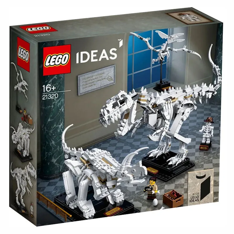 Das Dinosaurier-Fossilien-Set enthält baubare, bewegliche Spielzeug-Modelle der Skelette von Tyrannosaurus Rex, Triceratops und Pteranodon in einem Maßstab von 1:32.