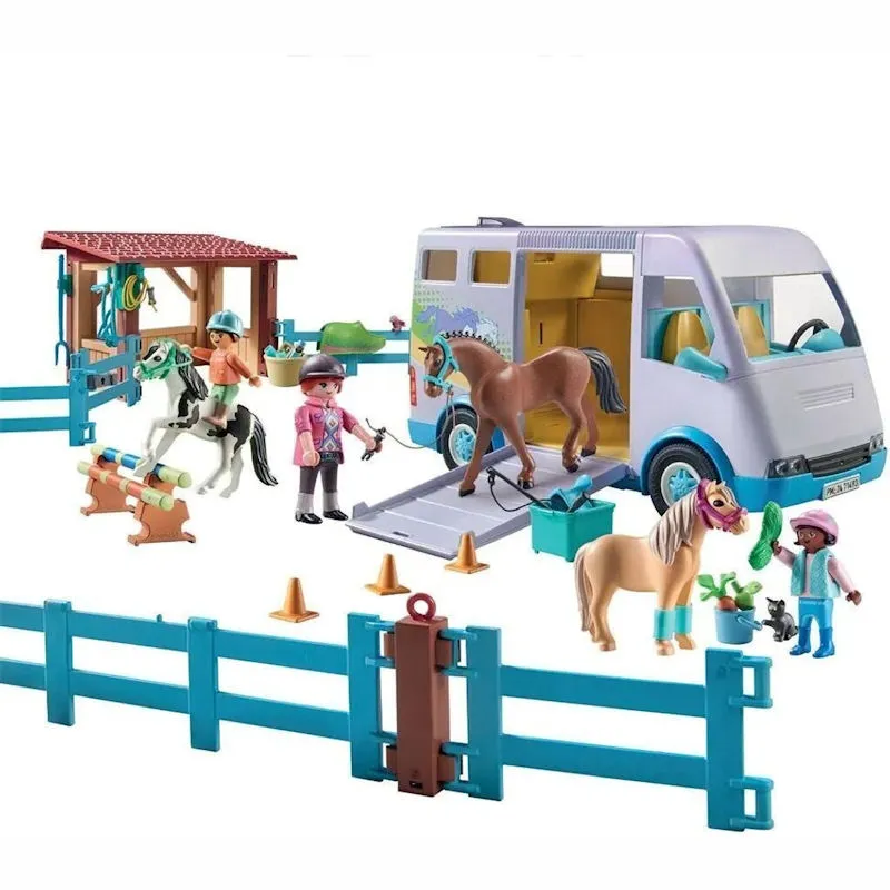Mit dem geräumigen Transporter, zwei Ponys und vielfältigem Zubehör kann das Abenteuer losgehen! Der Pferdetransporter sorgt mit seinem abnehmbaren Dach für einen einfachen Zugang. Zusätzlich enthält das Set Pferdedecken, Halfter, Sattel, Zaun und vieles mehr für stundenlangen Spielspaß!